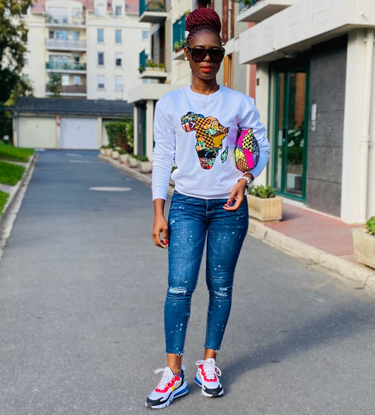 Sweat-shirt unisexe AFRICA blanc en patchwork artisanal – 100% coton