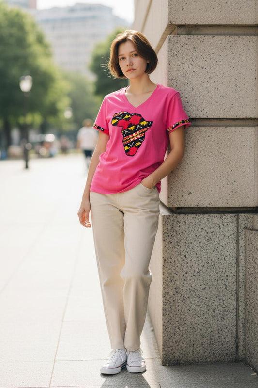 T-shirt Femme MONA Rose Col V, Stretch et Customisation Wax artisanale