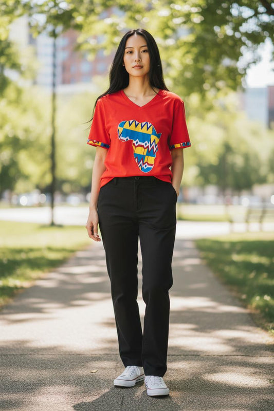 T-shirt Mixte “Africa” – Rouge Coton 100% et Customisation Wax faite main