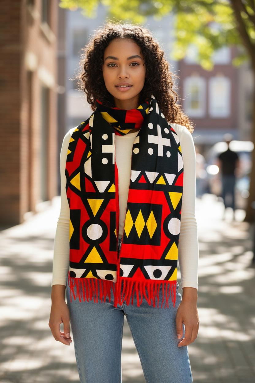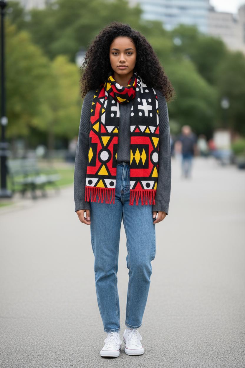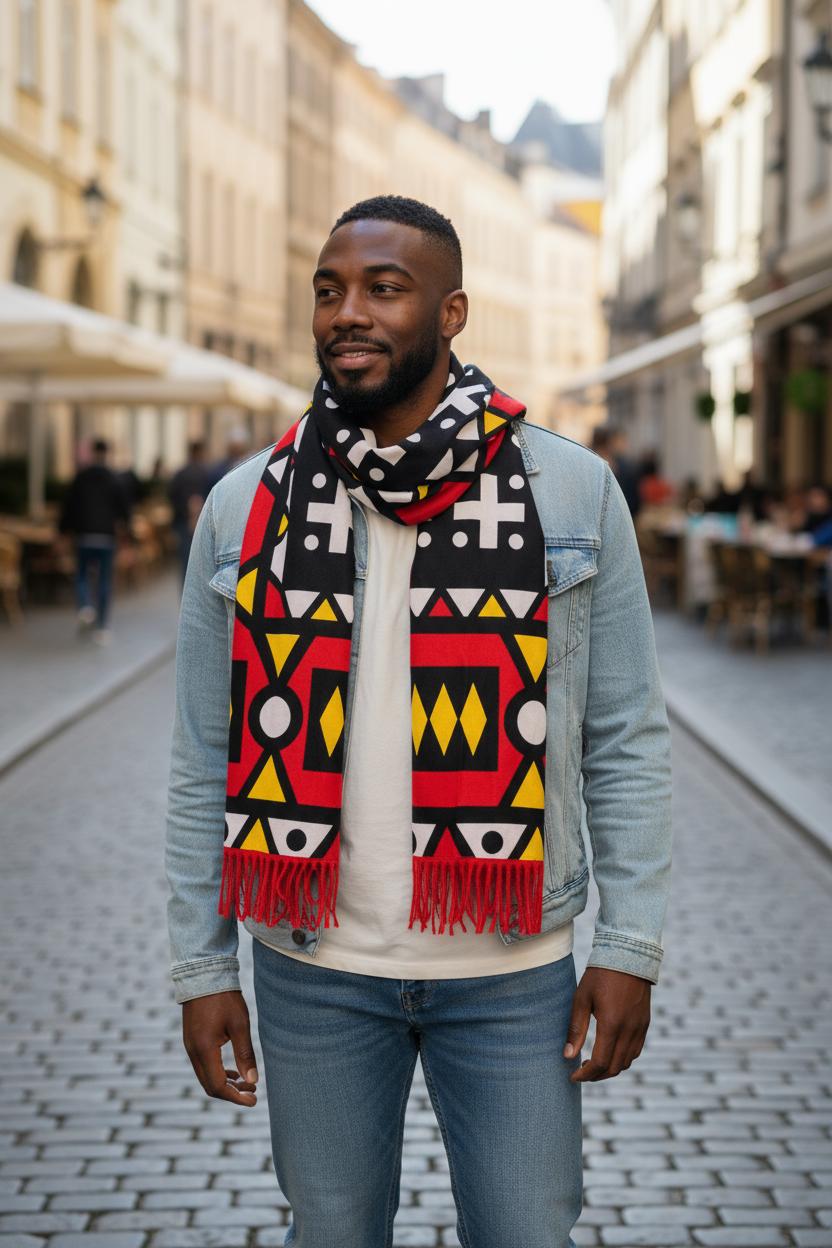 Magnifique écharpe customisée avec du wax. Á porter idéalement pour la saison automne/hiver. Cette écharpe est mixte pour hommes et femmes et gardera votre cou bien au chaud lors de vos sorties hivernales.
