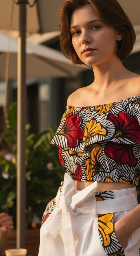 Composé d'un trop top en wax coloré et d'un short taille haute uni customisé avec des touches de wax et une ceinture à nouer assortie, cet ensemble célèbre la beauté des imprimés africains tout en restant moderne et facile à porter.