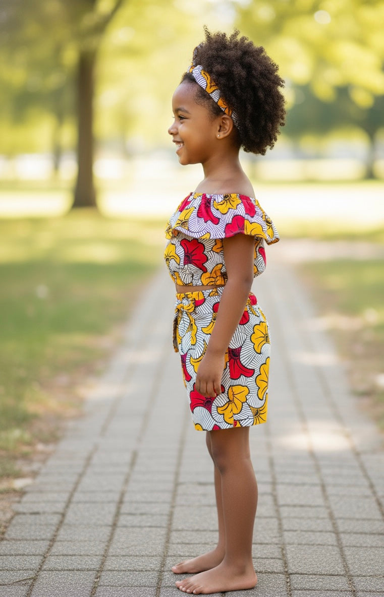Cet ensemble 3 pièces en wax coloré allie confort, style et originalité, parfait pour les journées ensoleillées, les sorties en famille ou les occasions spéciales .